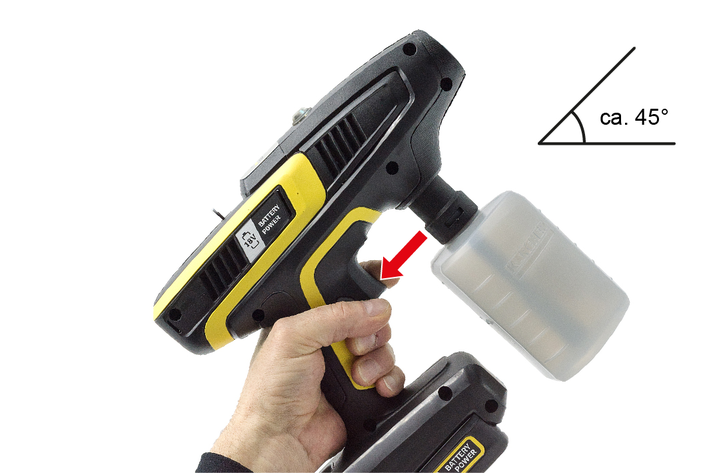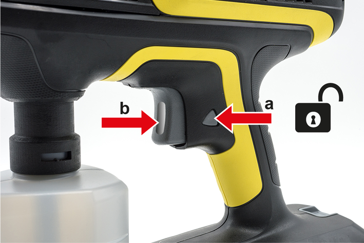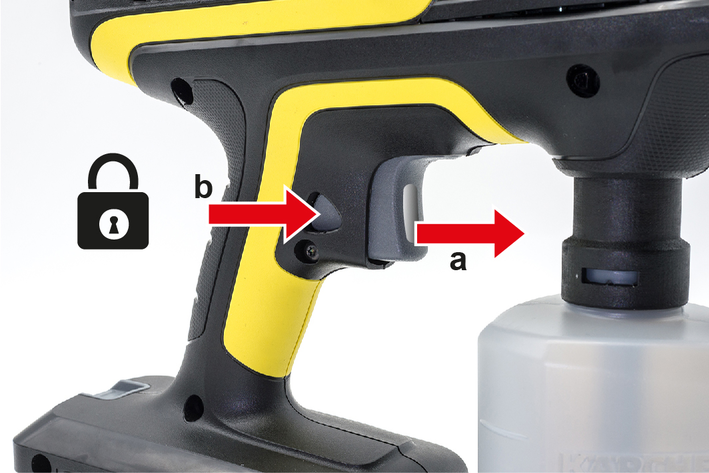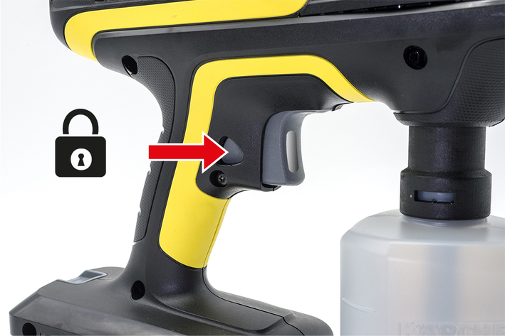 Press the locking button before every long interruption of work, before refilling the tank, removing the battery pack or transporting the device.