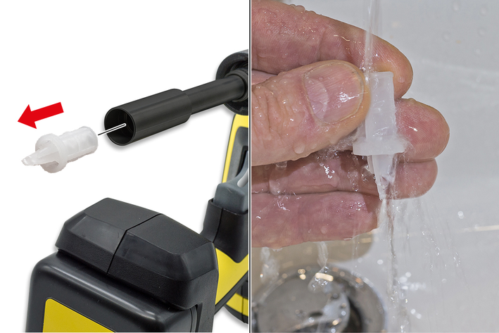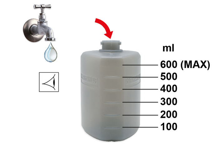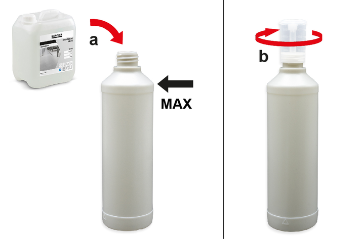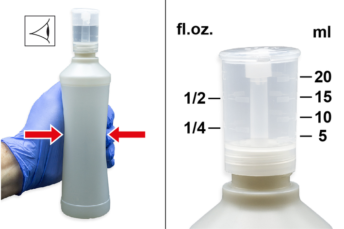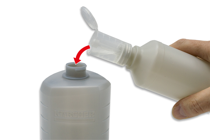 Squeeze the round bottle in the middle until the required amount of disinfectant has flowed into the dosing head.