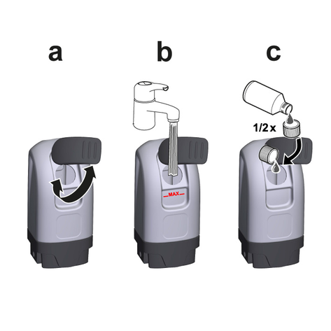 To prevent the tank from overflowing, be sure to leave enough space for the detergent or care agent when filling with water. To do this, observe the Max marking on the fresh water tank.