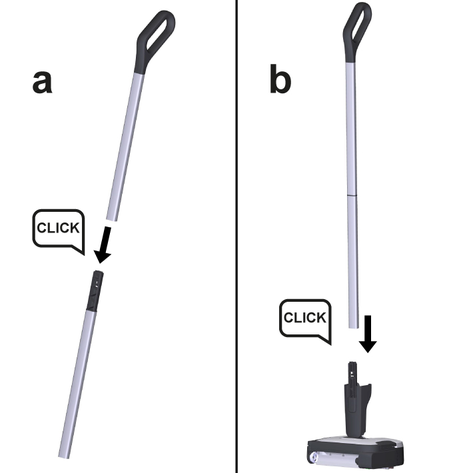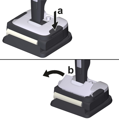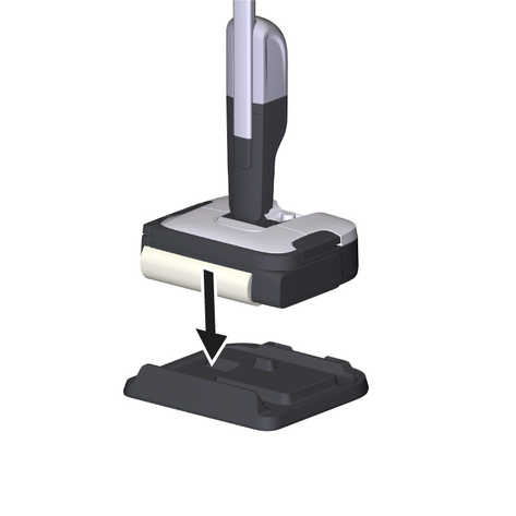 Place the device on the floor. Grasp the waste water tank by the recessed grip and insert it into the rail of the floor head.