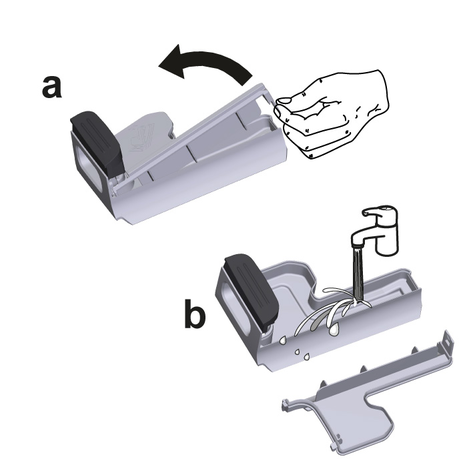 Grasp the fresh water tank by the recessed grips at the side and remove it from the device (45°).