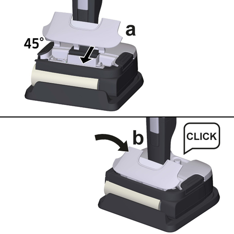 Fit the hair filter into the floor head at a 45° angle and then press it down until it audibly latches into place. The hair filter must sit tightly in the device.