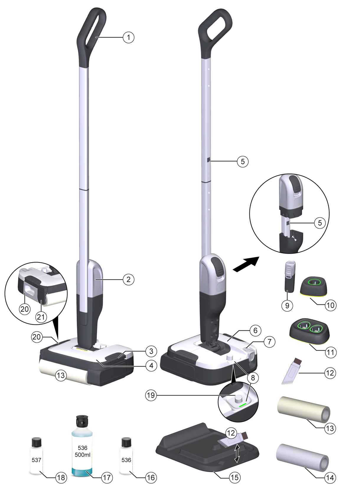The device is suitable for cleaning PVC, linoleum, tiled, stone, oiled and waxed parquet, laminate and all water-resistant floor coverings.