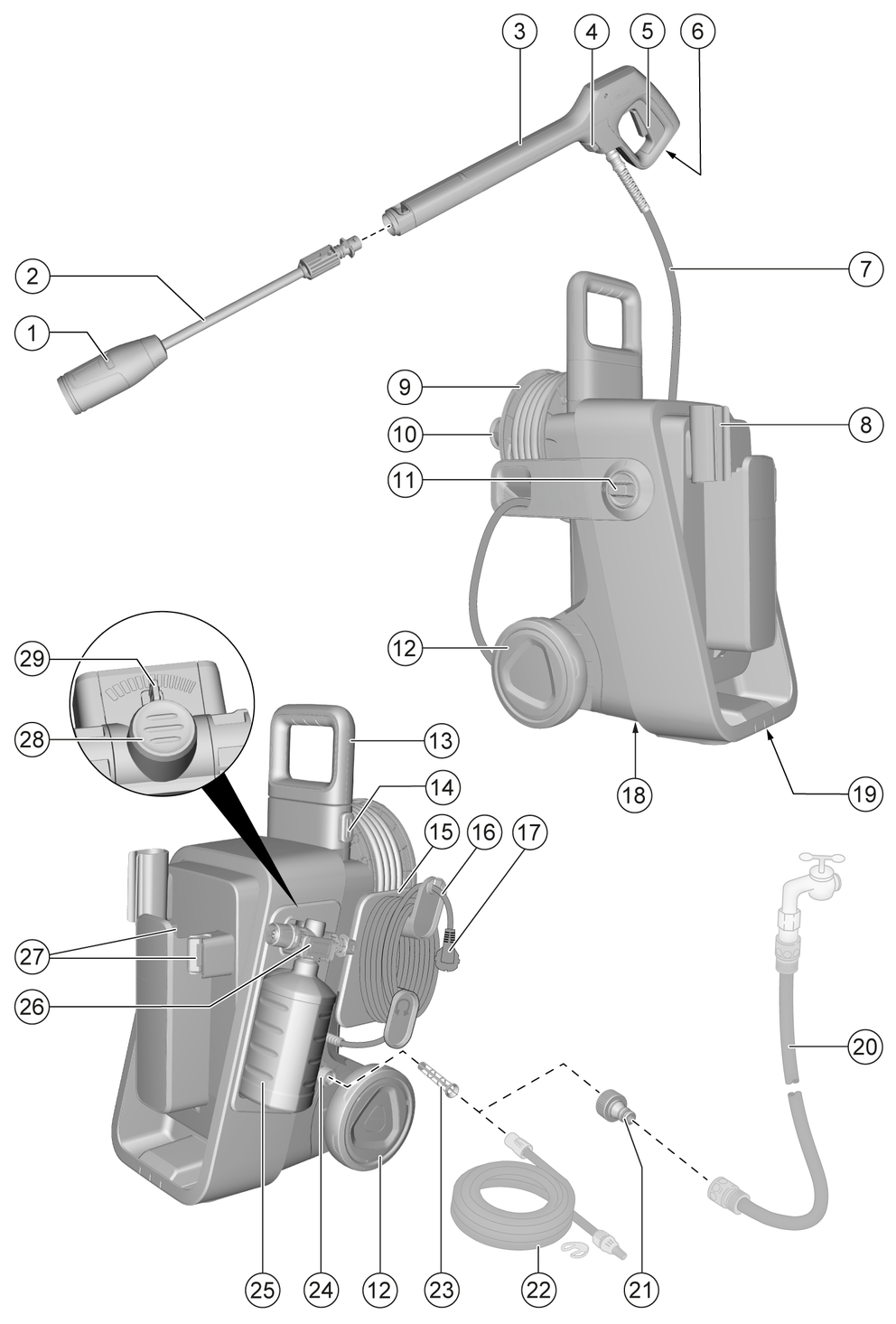 ![]() | Do not aim the high-pressure jet may at persons, animals, live electrical equipment or the device itself. Protect the device against frost. |