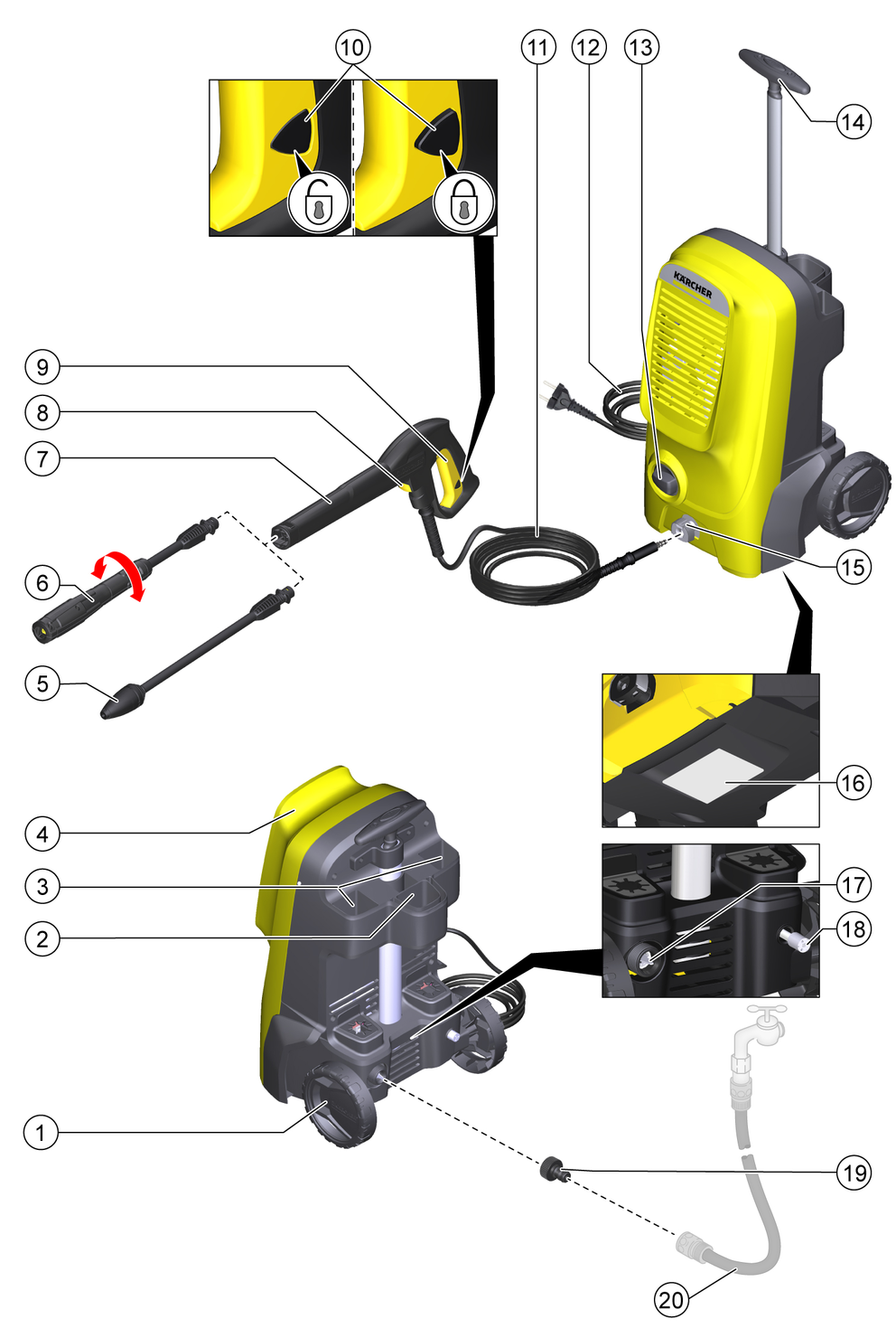 O bloqueio bloqueia a alavanca da pistola de alta pressão e impede o arranque inadvertido do aparelho.