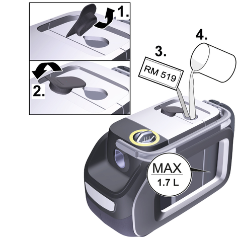 At the end of the cleaning work: Stow the device in the "drying position" (the filler cap is slightly open and any remaining liquid can dry without leaving any residue).