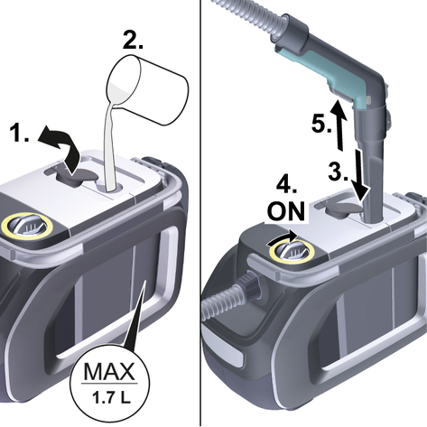 As the device does not have a dry vacuum function, if necessary remove coarse-grained dirt (e.g. crumbs) with a commercially available vacuum cleaner before cleaning the textiles.