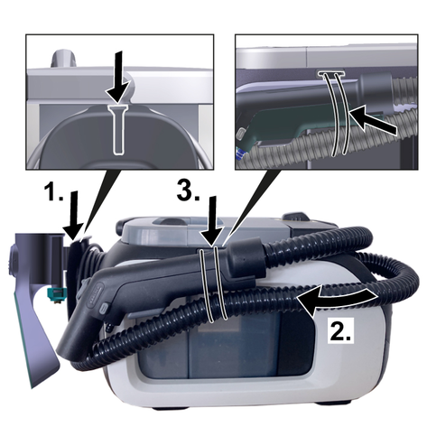 Attach the handle / hose from the spray suction hose to the accessory holder on the side of the device using the rubber band. Pay attention to the correct winding direction so that the handle or hose can be attached with the rubber band.
