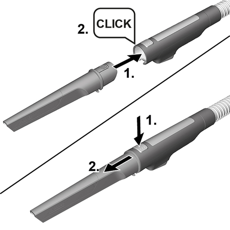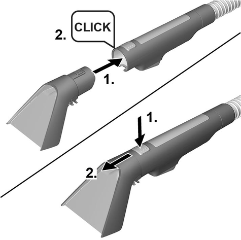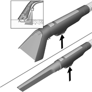 To separate the upholstery nozzle and crevice nozzle, press the catch on the handle and pull the spray/suction hose off.