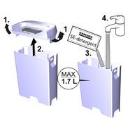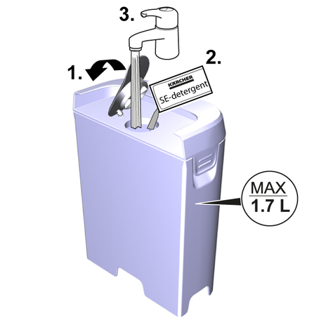 Pull the tank cap upwards and turn sideways. Dose the detergent according to the specifications and then fill the tank with tap water up to the "MAX" mark.