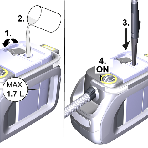 Before using the device, check the object to be cleaned for colour fastness and water resistance in an inconspicuous place.Fill the fresh water tank with detergent and water, see chapterFilling the fresh water tank.
