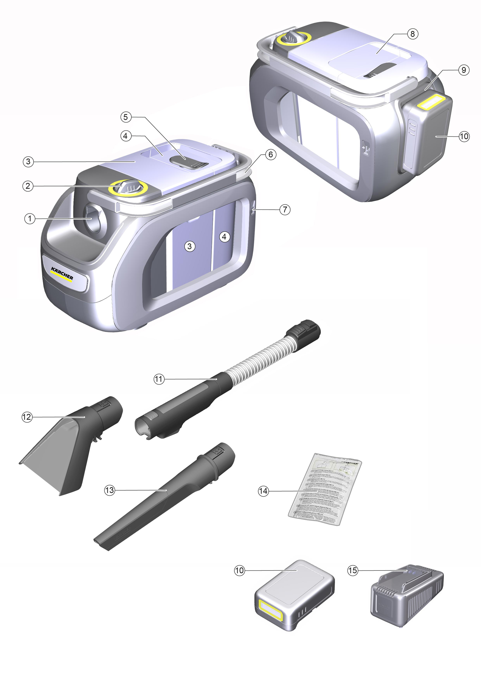 For operation, a battery pack of the KÄRCHER Battery Power (+) platform with 18 V nominal voltage and a suitable KÄRCHER charger with 18 V nominal voltage is required, which are not included in the scope of delivery.