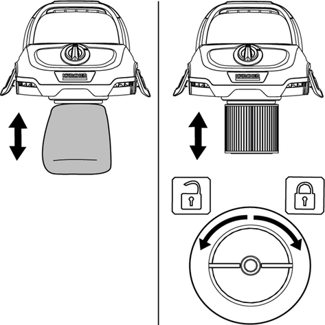 If necessary, the foam filter / cartridge filter can be cleaned under running water. To do this, remove the foam filter from the filter basket. The cartridge filter can be unlocked and removed by turning it towards the symbol