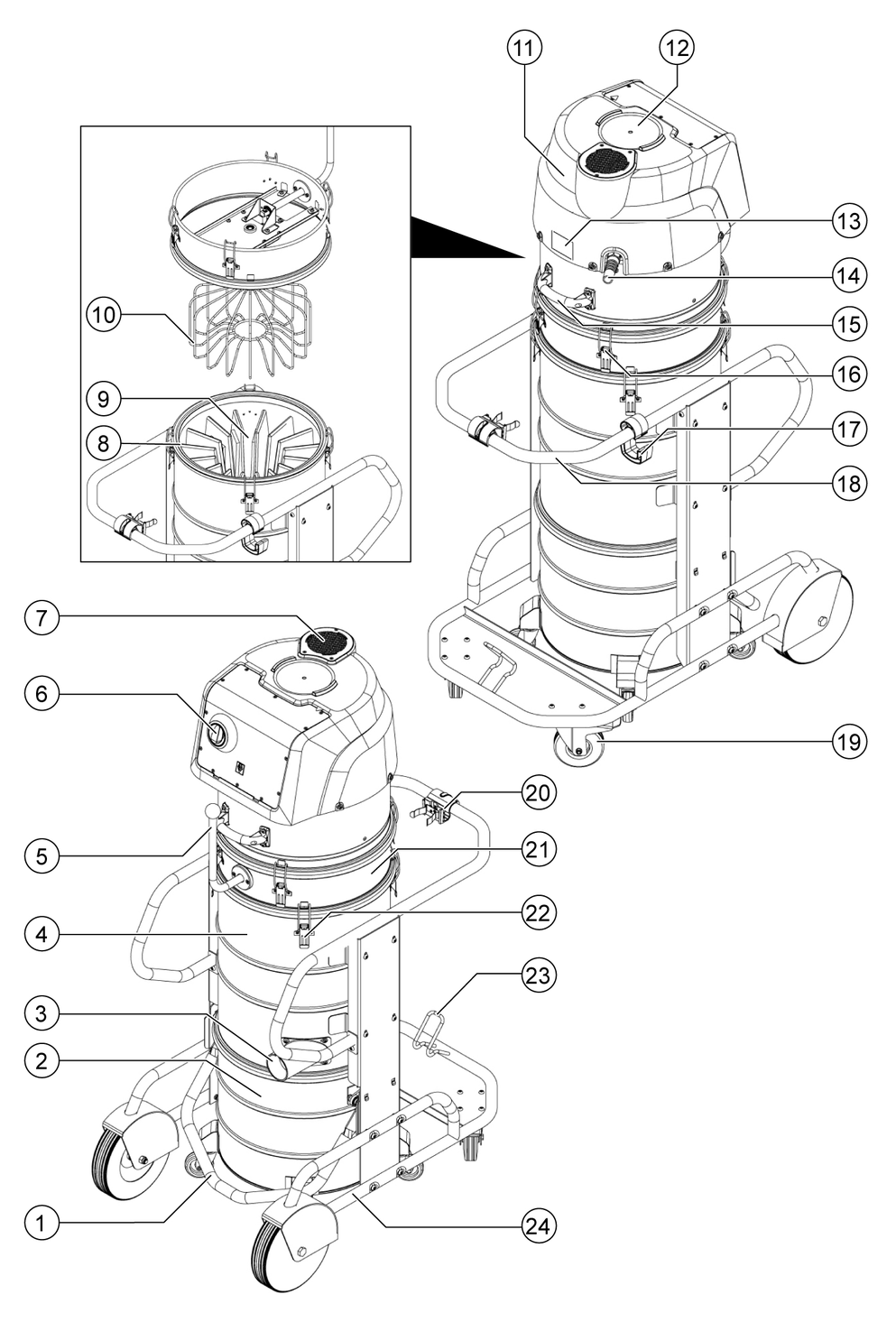 Under no circumstances should you hold your hands between the dirt receptacle and filter ring or allow them to come close to the lifting mechanism while locking it.Lock the dirt receptacle by operating the bow handle with both hands.Insert the dirt receptacle into the device in reverse order.