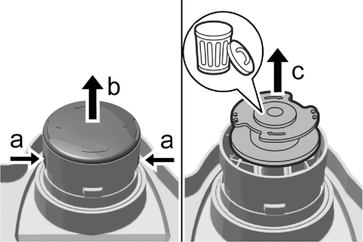 Press the string reel cover unlocking mechanism and remove the string reel cover.