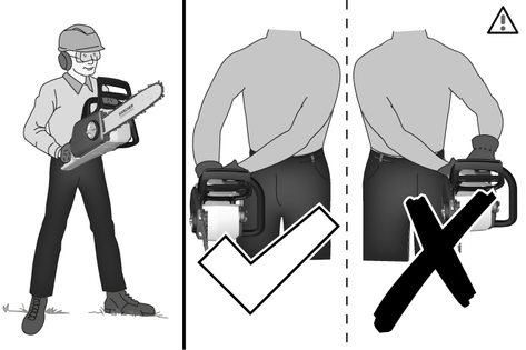Always hold the chainsaw tightly with both hands. Hold the handles with your thumb on one side and your fingers on the other side. Hold the rear handle with your right hand and the front handle with your left hand.