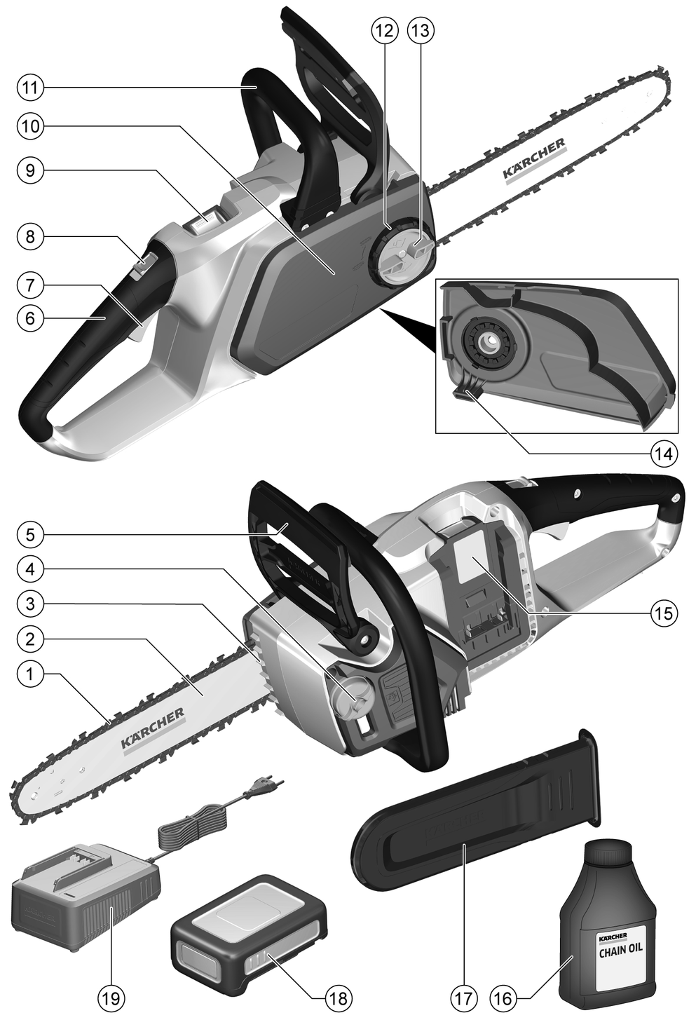 Before operation, make sure that the device, all control elements including the chain brake and safety devices are working properly. Check for loose locks, ensure that all protective devices and handles are correctly fitted and securely fastened. Only use the device when it is in a correct condition.