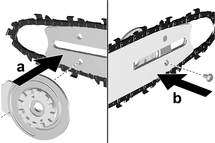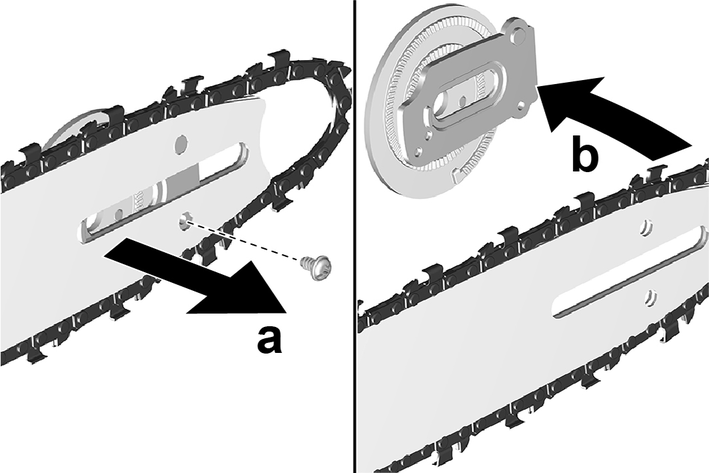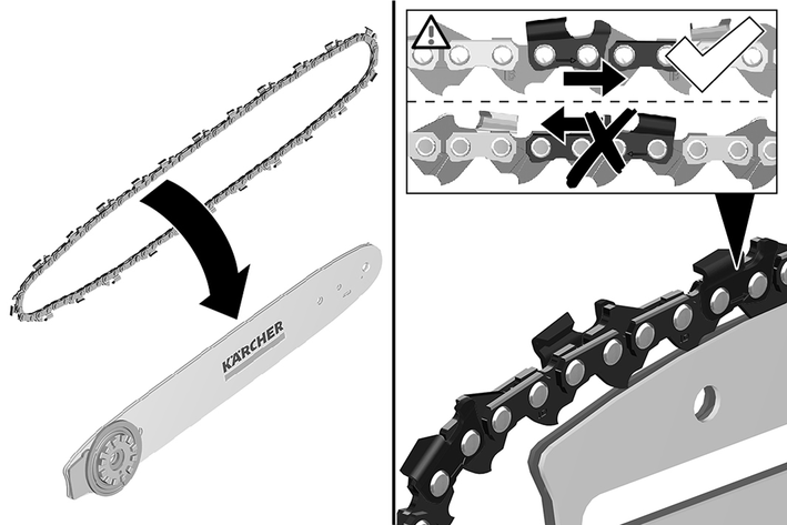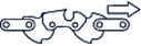Fit the new chain on the guide rail. Observe the direction of rotation of the chain.