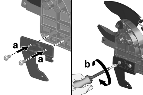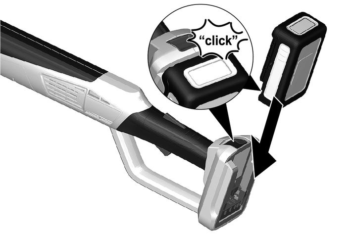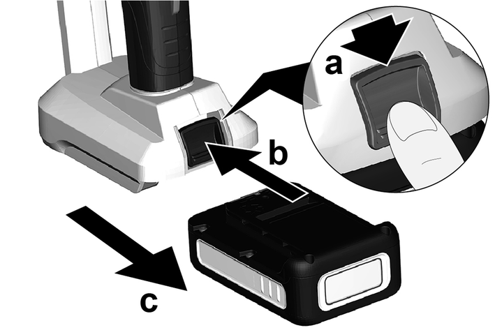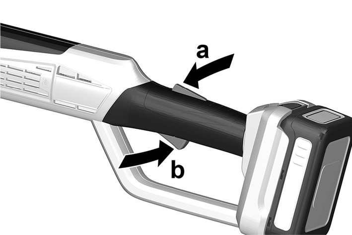 Always hold the device with both hands. Hold the front handle with one hand. With the other hand hold the rear handle, operate the unlocking button and the power switch.