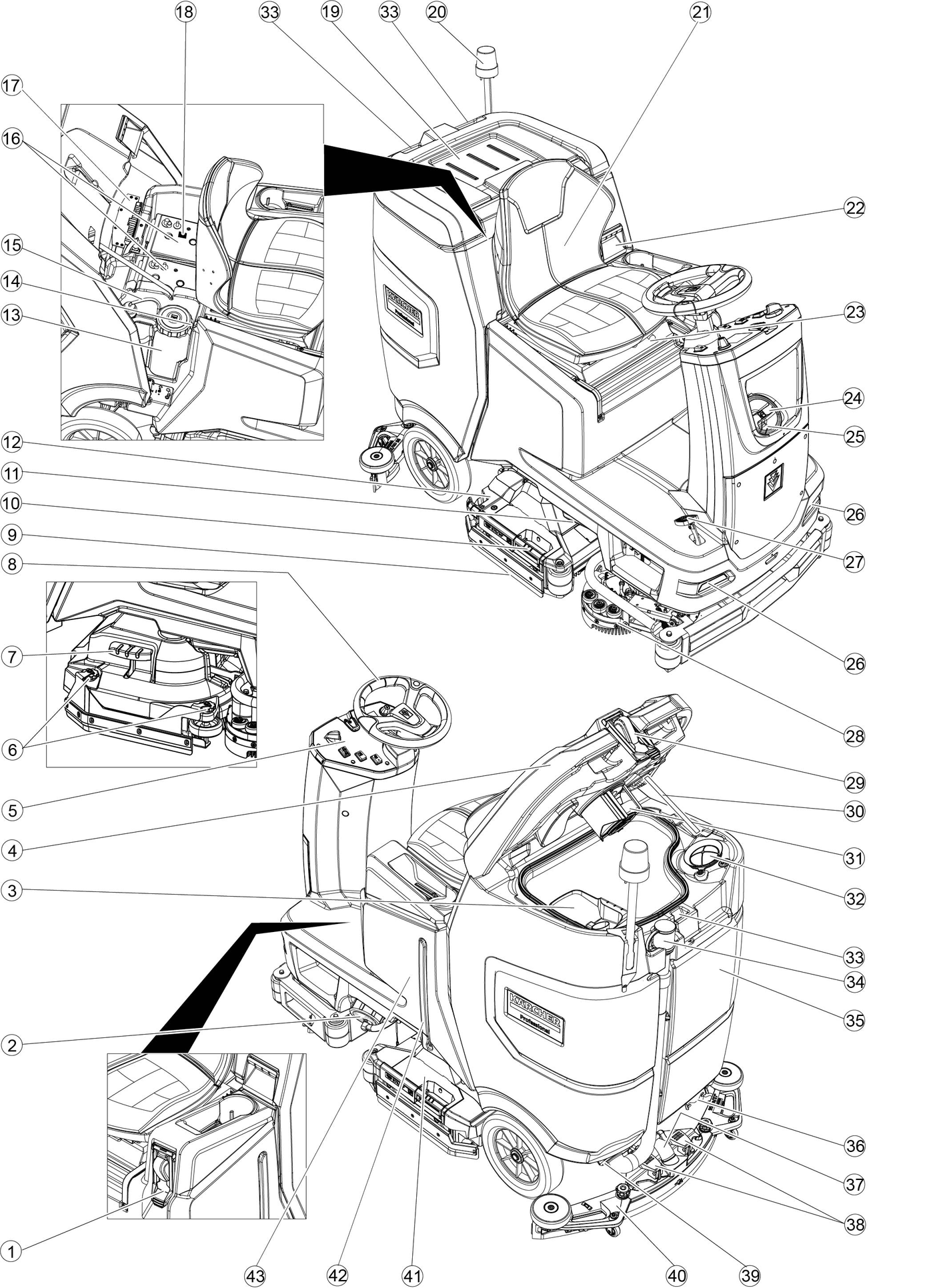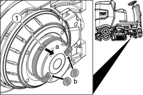 Drive slowly downhill.Do not turn on a slope.When driving fast, avoid jerky steering with a large steering angle.The Li-Ion version has built-in lithium-ion batteries. These are subject to special criteria. Removal and installation as well as testing of defective batteries may only be carried out by Kärcher customer service or a qualified specialist.