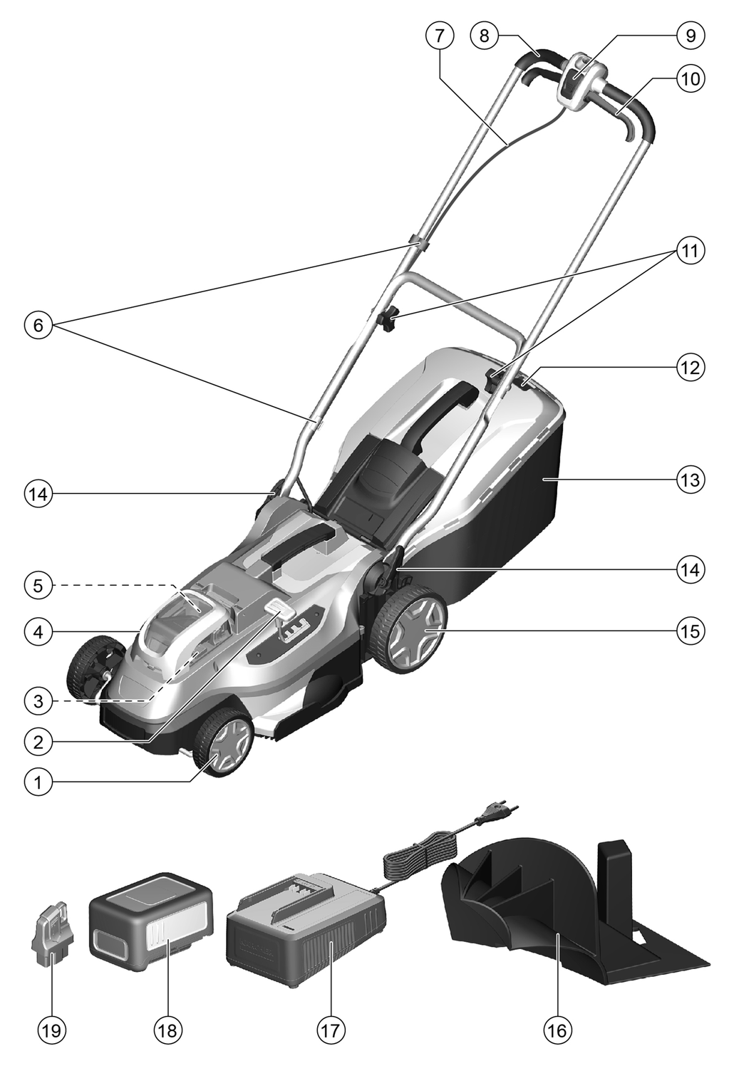 Stop the motor, in order to stop the blade when transporting the device to and from the mowing area or when tipping the device for crossing ground that is not covered with grass.