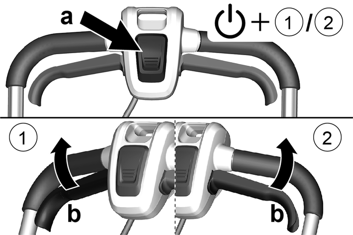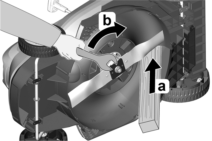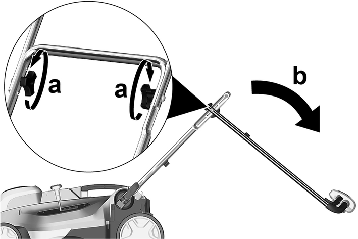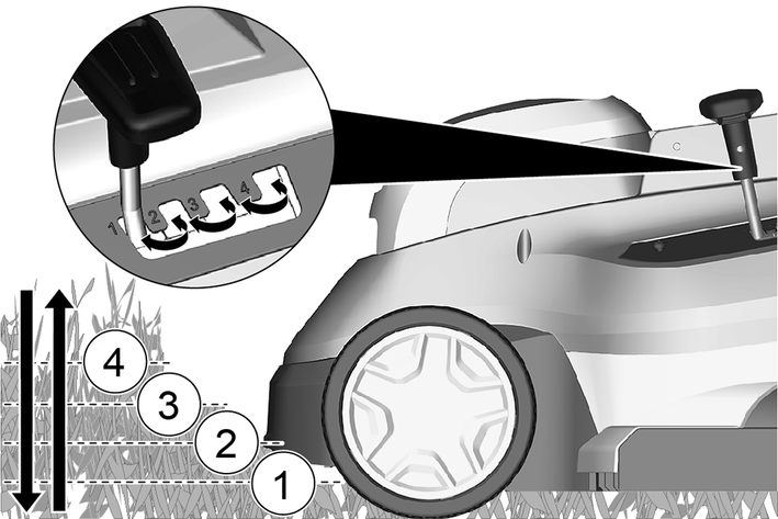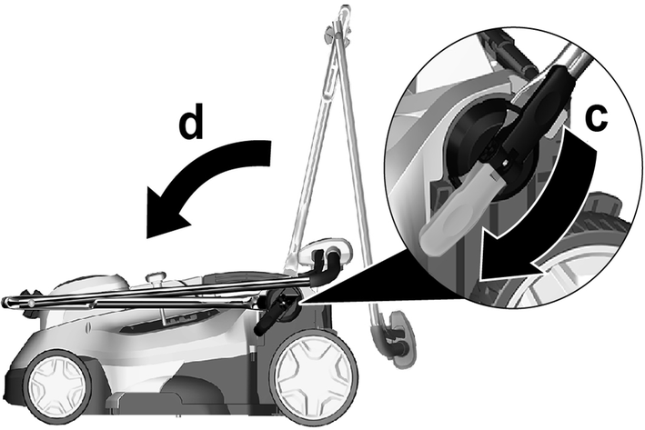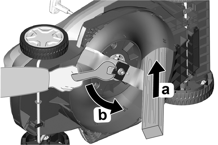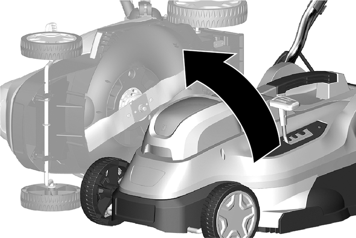 Danger of coming into contact with the open blade or being hit by flung objects. Do not tip the device when starting the motor or while the motor is running. If tipping is absolutely necessary, e.g. to make starting easier, then you can raise the front of the device by 5 cm. Press the handle carefully downwards for this. You must return the device to the normal operating position (i.e. all four wheels on the ground) before starting to mow.