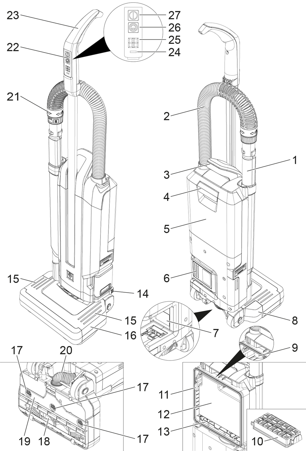Work interruption/end of cleaning: Lock the brush head. While doing so, step on the tread and swing the handle forward. The roller brush is switched off.