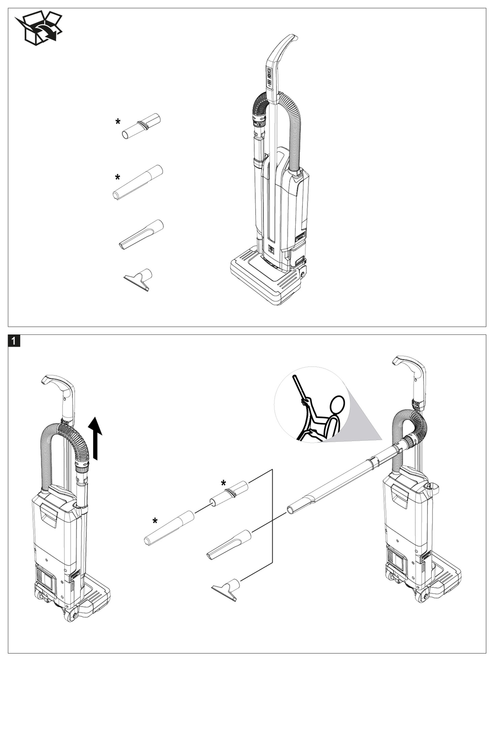 Unlock brush head. While doing so, step on the tread and swing the handle backwards. The roller brush is switched on.
