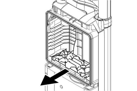 Press the filter bag lock to the right and at the same time pull the filter bag downwards by the flange. Remove the filter bag, close it and dispose of it.