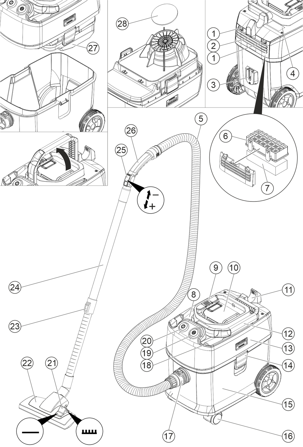 Eco button (energy-saving mode): The device works with reduced suction performance. The battery run time is extended.