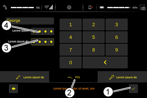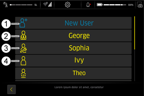Each user can be granted or denied permissions for various device functions via the touch screen of the device.