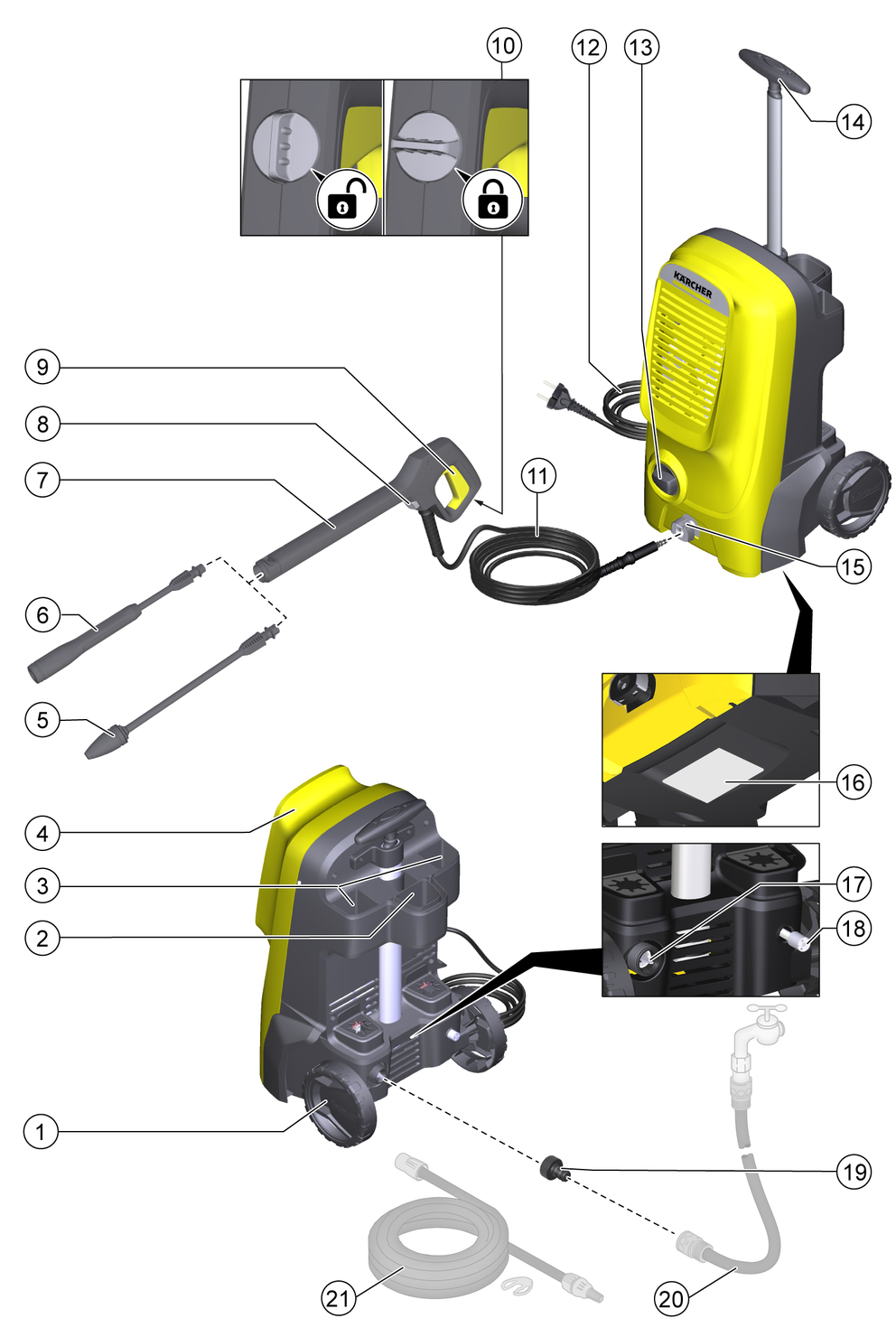 O bloqueio bloqueia a alavanca da pistola de alta pressão e impede o arranque inadvertido do aparelho.