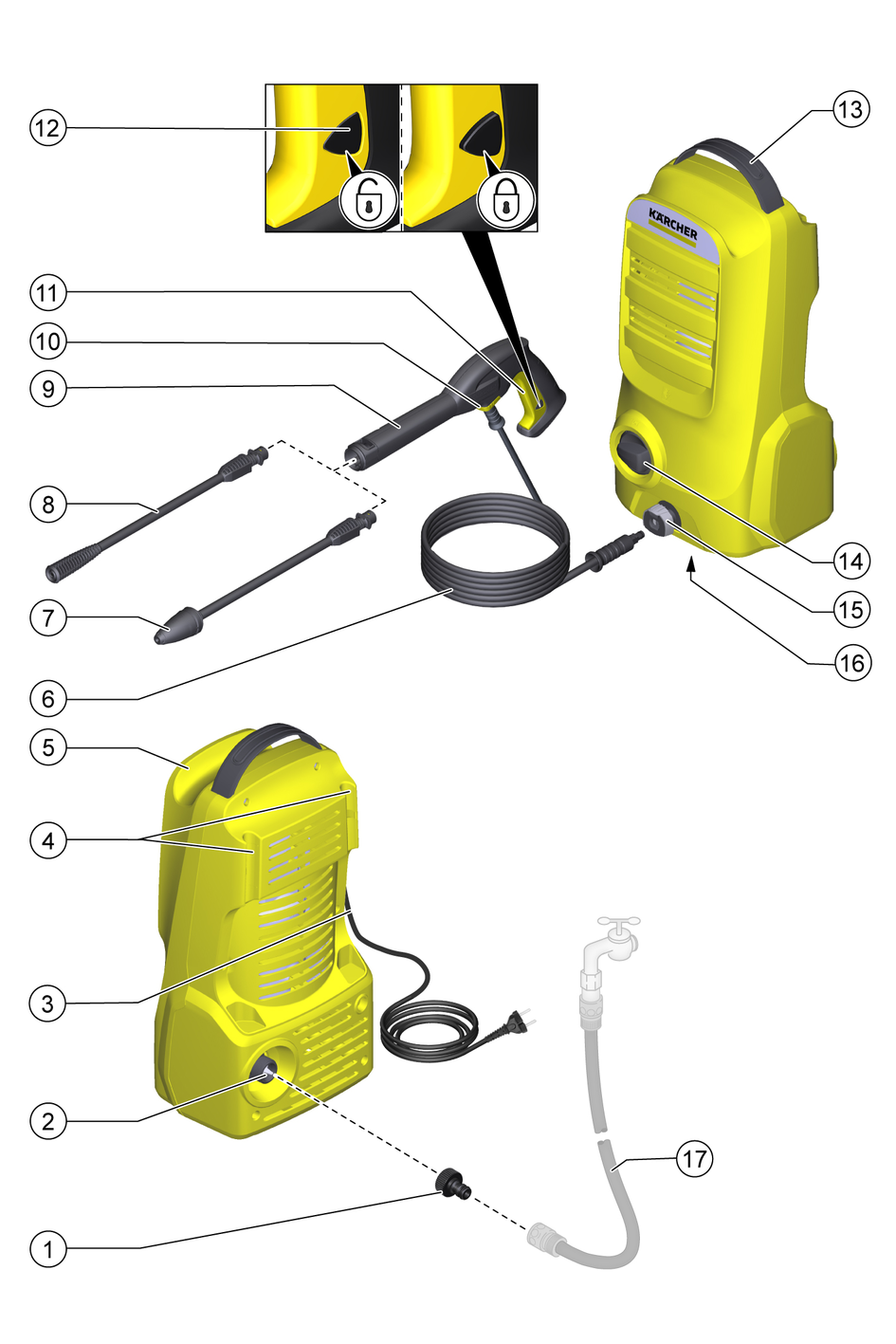 ![]() | Do not aim the high-pressure jet may at persons, animals, live electrical equipment or the device itself. Protect the device against frost. |