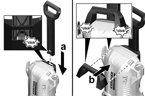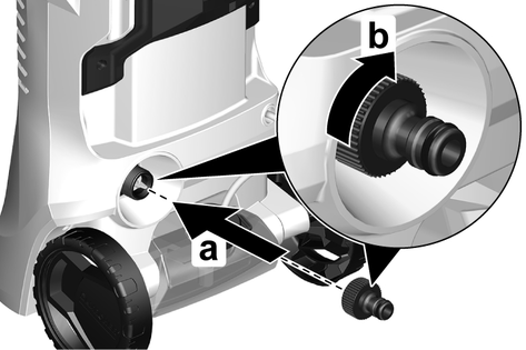 Utilize apenas acoplamentos de mangueiras com/sem função AquaStop da Kärcher, acoplamentos de mangueiras sem função AquaStop ou acoplamentos de mangueiras de plástico com função AquaStop de terceiros.Inserir a mangueira de jardim no acoplamento para a ligação de água.
