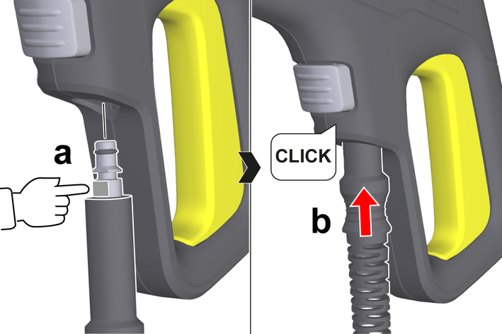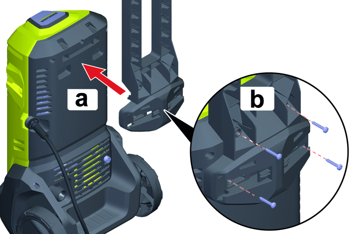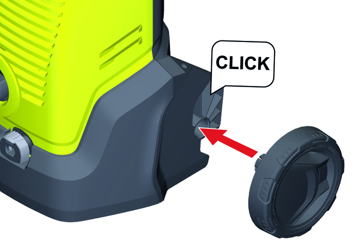 Push in the storage option for the high-pressure hose / mains connection cable into the holder on the transport handle.