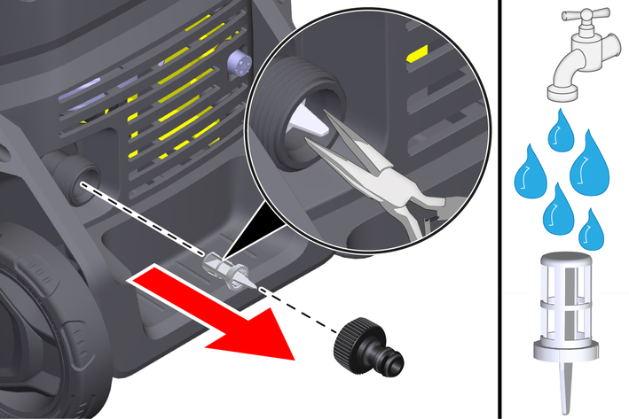 Pull the sieve in the water connection out using flat pliers.