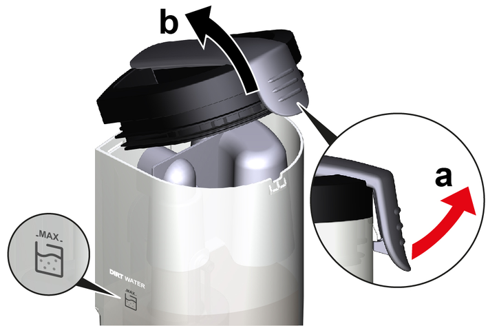 Steps 1 - 6, which are required for the cleaning the system, can be found on a label on the inside of the waste water tank, see chapter Symbols on the device