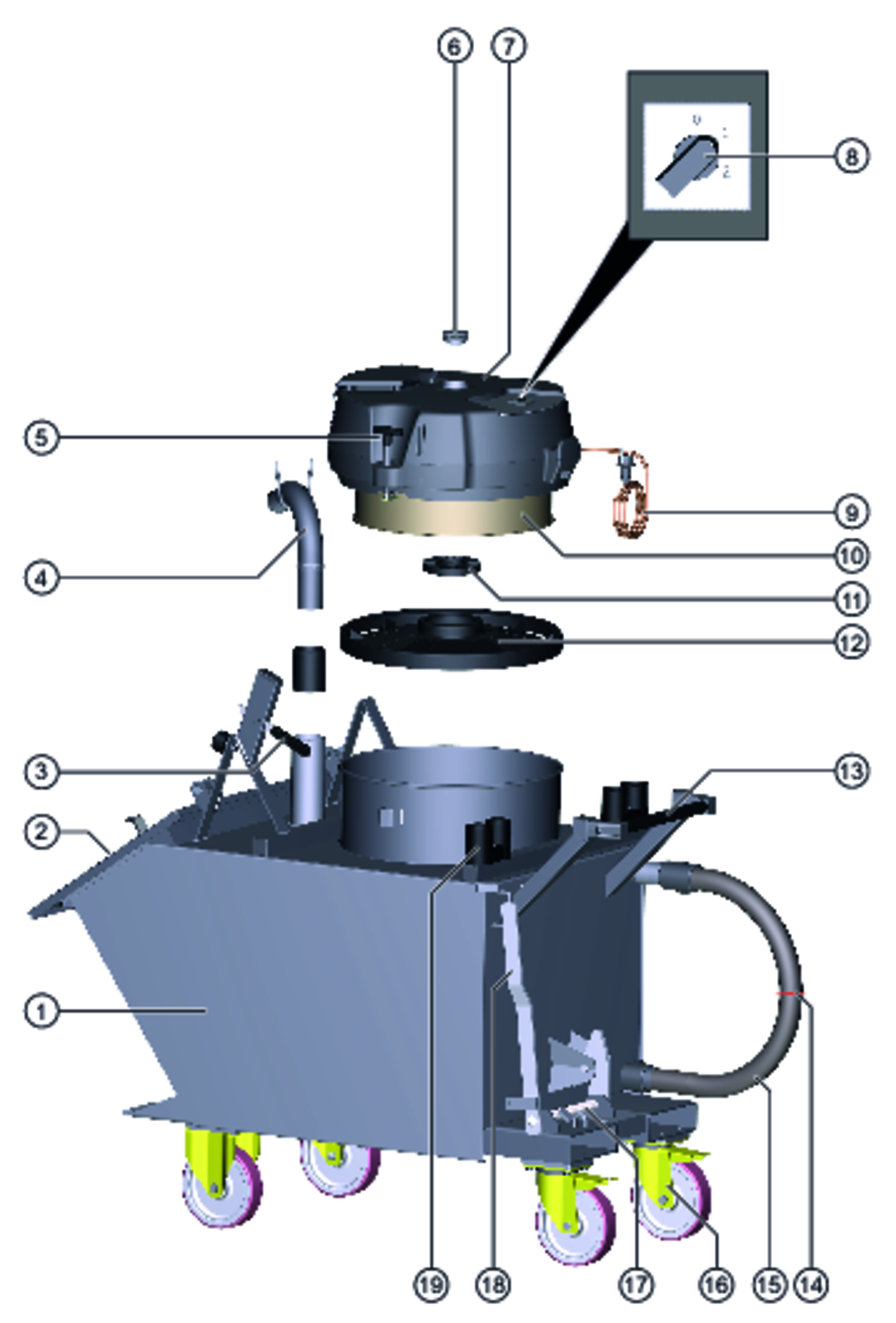 Risk of crushing! Wear gloves when removing or installing the suction head, filter inlay or collection container.