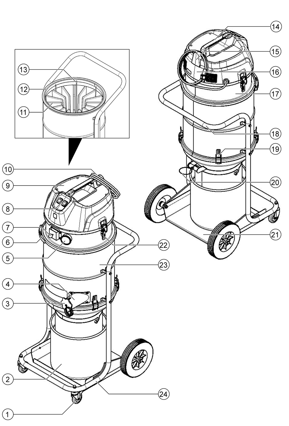 Do not vacuum without correctly installed filter elements, otherwise a danger to health from increased fine dust emission is present.The device is an industrial vacuum cleaner for vacuuming dry, non-inflammable dusts with MAK values ≥ 0.1 mg/m3.
