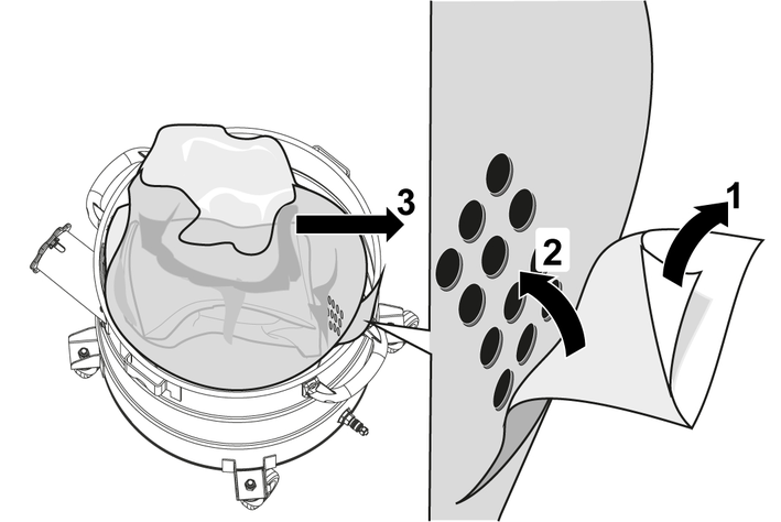 Depending on the application, insert the dust bag or the safety filter bag before dry vacuuming (see chapter Dry vacuuming)